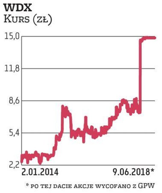 WOHO Holding ogłosiło wezwanie do sprzedaży akcji WDX pod koniec zeszłego roku. Oferowało 14,88 zł za akcję. Skupiło walory stanowiące ponad 20,7 proc. kapitału i uprawniające do prawie 18 proc. głosów. Łącznie z Bąkowskim po zakończeniu wezwania wzywający mieli ponad 98 proc. głosów i wtedy ruszył przymusowy wykup pozostałych papierów.