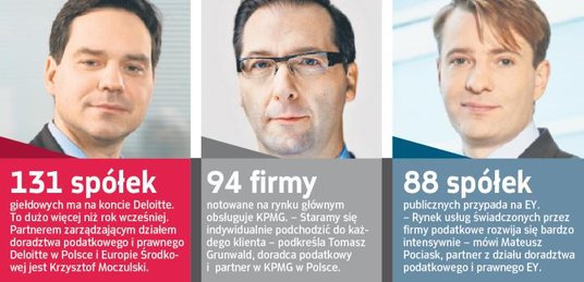 Dobrze wypadają też mniejsze kancelarie. Teoretycznie mają teraz większe szanse na zawojowanie rynku, jako że rok temu w życie weszła nowa ustawa o biegłych rewidentach, wprowadzająca zakaz świadczenia usług doradczych w audytowanych podmiotach. – Część firm z uwagi na ograniczenia audytowe zmuszona jest zakończyć współpracę ze swoimi dotychczasowymi doradcami, co z kolei przekłada się na rosnącą liczbę zapytań ofertowych, kierowanych do obecnych na rynku firm – potwierdza Cezary Przygodzki, partner współkierujący zespołem doradztwa podatkowego w kancelarii Dentons.