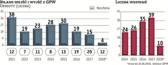 Na drugim biegunie mamy spółki wycofywane z obrotu. W 2017 r. z parkietu zniknęła rekordowa liczba 20 firm, a wiele wskazuje, że w 2018 r. będzie ich jeszcze więcej. Od stycznia wycofano walory dwunastu emitentów, trwa kilka wezwań, a w kilkunastu spółkach toczy się przegląd opcji strategicznych.