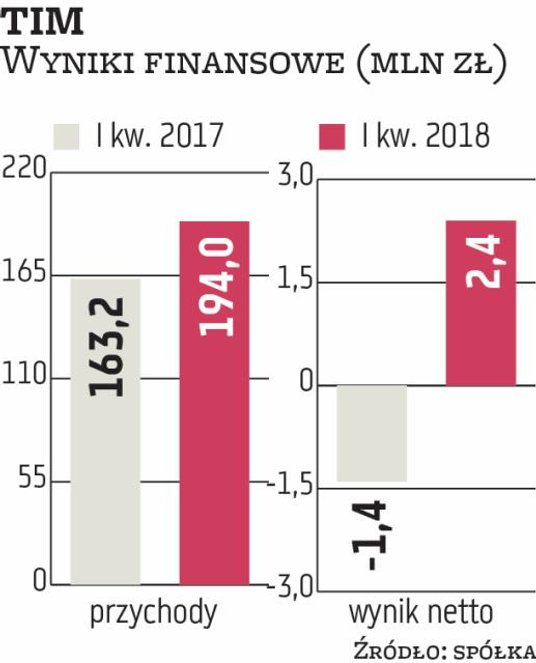 Spółka już teraz jest największym krajowym dystrybutorem artykułów elektrotechnicznych, ale jej udział w rynku sięga zaledwie 7 proc. To dlatego, że branża jest mocno rozdrobniona. TIM z kwartału na kwartał zwiększa swoją przewagę nad konkurencją. W I kw. 2018 r. wypracował niemal 194 mln zł przychodów, co oznacza wzrost o 19 proc. w porównaniu z tym samym okresem ubiegłego roku. To najlepsze otwarcie roku i drugi najlepszy kwartał w historii TIM. Poprawił się także wynik netto, który wyniósł 2,4 mln zł, podczas gdy przed rokiem grupa miała 1,4 mln zł straty.