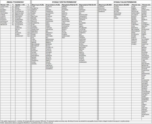 Długoterminowy złoty krzyż (skrzyżowanie średnich kroczących z 50 i 200 sesji) pojawił się na wykresach 4 spółek: Chemos, Izolacja, NTT System i Rainbow Tours. Analogiczny krzyż śmierci widoczny jest na wykresach 8 spółek: Action, Agora, AviaAM Leasing, Bytom, ES-System, K2 Internet, OEX i PGNiG. Co najmniej roczne maksima notowań wyznaczyło 24 spółek, a roczne minima aż 68 spółek. Pełne listy firm z poszczególnymi sygnałami i statystykami znajdują się w tabeli.