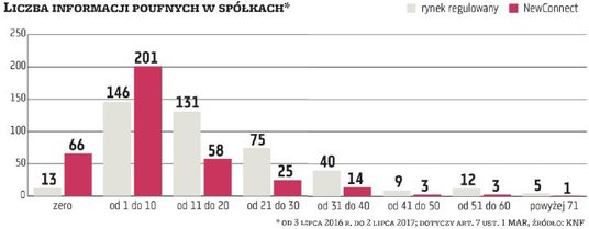 Wyniki ankiety są też dobrym materiałem analitycznym. – Intrygująca dla nas była np. liczba informacji poufnych powstałych u niektórych emitentów (maksymalnie 179) czy też liczba 231 osób wpisanych w sekcji osób mających stały dostęp do informacji poufnych (część listy insiderów) – wskazuje Wąchała. Zaskakujący jest również sam fakt, że ponad 71 proc. emitentów w ogóle zdecydowało się taką sekcję sporządzić (jest ona fakultatywna).