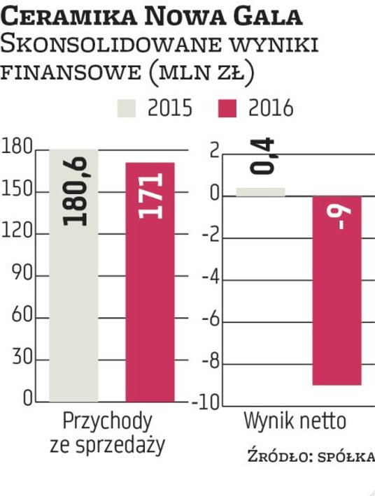 W ubiegłym roku Ceramika Nowa Gala zanotowała spadek skonsolidowanych przychów o 5,4 proc., do 171 mln zł. Poniosła też 9 mln zł czystej straty. W 2015 r. miała 0,4 mln zł zysku netto. Do pogorszenia się kondycji grupy przyczynił się przede wszystkim rynek krajowy oraz spadek średnich cen sprzedawanych produktów. Zwyżki zanotowano za to w eksporcie. Istotny wpływ na tegoroczne wyniki będzie miała przede wszystkim koniunktura gospodarcza w Polsce, w tym w obszarze budownictwa komercyjnego (centra handlowe, biurowce, hotele, magazyny). TRF