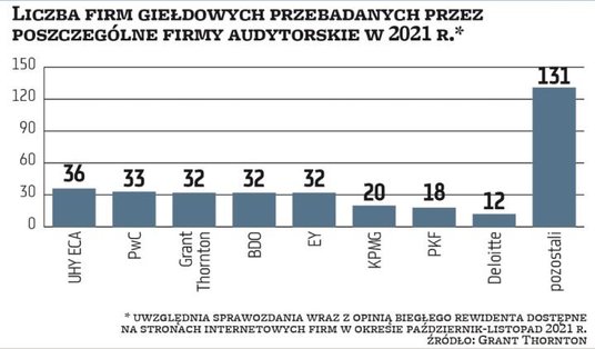 W ostatnich latach na rynku audytu (w szczególności w segmencie jednostek zainteresowania publicznego, czyli m.in. spółek giełdowych) przeprowadzono szereg rygorystycznych zmian legislacyjnych, skutkujących coraz wyższymi wymogami. Mocno wzrosła liczba obowiązków, koszty oraz odpowiedzialność firm audytorskich i biegłych rewidentów. W efekcie liczba audytorów badających sprawozdania spółek giełdowych z roku na rok spada. Z działalności w tym segmencie rezygnują przede wszystkim małe firmy. W 2021 r. sprawozdania finansowe spółek notowanych na rynku głównym badało 48 podmiotów, czyli o 13 mniej niż w 2020 r., o 33 mniej niż pięć lat temu i aż o 63 mniej niż dziesięć lat temu. Średnio na jednego audytora w zeszłym roku przypadało około ośmiu spółek.