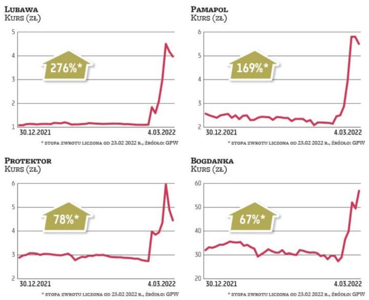 Nieoczekiwanie popularnością znów cieszą się spółki węglowe, jak Bogdanka i JSW, oraz związane z branżą węglową, jak Bumech czy Famur. Drastyczne sankcje nałożone na Rosję oznaczają dużą niepewność dostaw tego surowca ze Wschodu, jak i perspektywę dłuższego wykorzystywania węgla zamiast gazu. To wszystko stwarza okazję krajowym spółkom węglowym jak i firmom z nimi współpracującym, np. dostarczającym maszyny górnicze. Na to jeszcze nałożył się dynamiczny wzrost cen węgla oraz dobra koniunktura na rynku stali. – JSW jest jednym z głównych beneficjentów nowej rzeczywistości. Jednym z jej elementów jest perspektywa wprowadzenia unijnego embarga na rosyjski węgiel – wskazuje Antoni Kania, analityk BM mBanku. – Rosja była znaczącym producentem węgla energetycznego i koksującego, posiadającym odpowiednio ok. 20 i 11 proc. udziałów w globalnym eksporcie. Mniejsza podaż surowca ze Wschodu stwarza korzystne otoczenie dla biznesu spółki. Wsparciem są wysokie ceny węgla, które znacząco wzrosły po decyzji o nałożeniu sankcji na Rosję. Kontrakty na węgiel koksujący poszybowały o kilkadziesiąt procent w górę. To oznacza, że należy się spodziewać zwyżek cen także w dłuższym terminie. Nie bez znaczenia jest również zaktualizowana strategia spółki, która została optymistycznie przyjęta przez rynek. Wśród pozytywów należy wymienić plany zwiększenia wydobycia, wzrost udziału produkcji węgla koksowego i poprawę rentowności poprzez m.in. ograniczenie kosztów osobowych – dodaje.