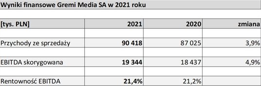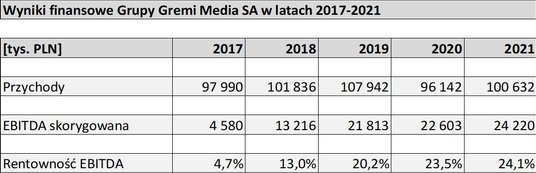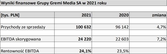 Najwyższy w historii poziom zysku EBITDA, przychody znów powyżej 100 mln zł, a 2021 r. był czwartym z kolei, gdy poprawiły się wskaźniki rentowności prowadzonej działalności. Tak wyglądał wynik finansowy grupy kapitałowej Gremi Media SA w ubiegłym roku. I to pomimo ograniczenia części działalności ze względu na pandemię.