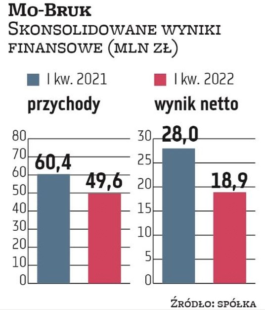 W czwartek przed południem kurs akcji Mo-Bruku spadał nawet do 303,5 zł, czyli o ponad 9,9 proc. Powodem zwiększonej podaży walorów spółki były niewątpliwie gorsze od oczekiwanych wyniki finansowe wypracowane w I kwartale. W tym czasie grupa osiągnęła 49,6 mln zł przychodów i 18,9 mln zł zysku netto, co oznaczało ich zniżkę w ujęciu rok do roku o 17,9 proc. oraz o 32,4 proc. Pogorszenie kondycji grupy to konsekwencja braku wpływów z zagospodarowania tzw. bomb ekologicznych. Dotychczas był to jeden z ważniejszych obszarów działalności firmy, który dodatkowo zapewniał ponadprzeciętną rentowność.