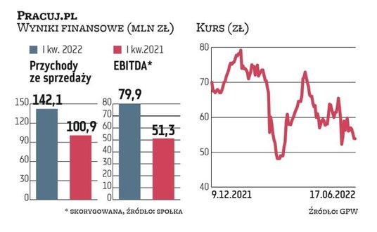 Pomimo perspektywicznej niszy w branży HR Tech komunikat o przejęciu Softgarden (a konkretnie jej właściciela Spoonbill Holding) nie przełożył się na wzrost notowań Grupy Pracuj. Po silnej przecenie wywołanej rosyjską agresją na Ukrainę jej kurs nie wrócił już do poziomu z grudniowej oferty publicznej, gdy akcje spółki sprzedawano po 74 zł.