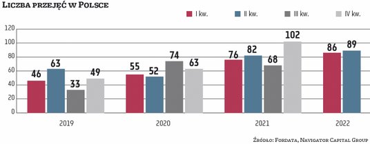 W II kwartale 2022 r. na polskim rynku zrealizowano 89 transakcji przejęć – wynika z najnowszego raportu Fordaty i Navigatora. To o siedem więcej w ujęciu rok do roku (+8,5 proc.) oraz o trzy więcej kwartał do kwartału (+3,5 proc.).