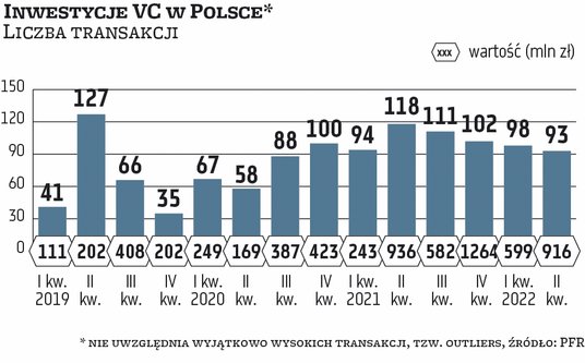 Eksperci są zaskoczeni wynikiem, jeśli patrzeć przez pryzmat trendów na innych rynkach, i podkreślają, że na razie nie widać ani efektu wojny, ani hamowania gospodarek. Na te może być za wcześnie. W tym kontekście kluczowe mogą okazać się wskaźniki za III kwartał. Aleksander Mokrzycki, wiceprezes PFR Ventures, jest optymistą. Jak wskazuje, I połowa br. okazała się być o 76 proc. mocniejsza niż w 2021 r. – Dalej możemy obserwować ogólny wzrost średniej wartości transakcji. Zachowanie tego kierunku może przełożyć się na kolejny rekord na polskim rynku VC – podkreśla. I szacuje, że na koniec br. rynek w naszym kraju może przebić historyczny pułap 4 mld zł (w ub.r. było to ponad 3,6 mld zł).