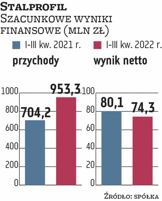 W III kw. szacunkowe przychody Stalprofilu wzrosły względem analogicznego okresu ubiegłego roku o 16 proc., do 307,7 mln zł. Z kolei zysk netto stopniał o 50 proc., do 12,3 mln zł. Podobnie sytuacja wygląda, jeśli spojrzymy na rezultaty po I–III kw. Przychody podskoczyły o 35 proc., do 953,3 mln zł, jednak zysk netto spadł o 7 proc., do 74,3 mln zł. – Zagrożeniem dla utrzymania wolumenu sprzedaży na rynku stali jest rosnąca inflacja i konieczność chłodzenia gospodarki w celu jej obniżenia. Stal należy do dóbr inwestycyjnych, a wydatki na inwestycje są szczególnie wrażliwe na spadek koniunktury gospodarczej. Dodatkowym zagrożeniem dla krajowych planów inwestycyjnych jest perspektywa wstrzymania przez UE przewidywanych wcześniej wypłat z funduszy unijnych w związku z eskalacją konfliktu z władzami polskimi wokół praworządności – podsumował Orczykowski.