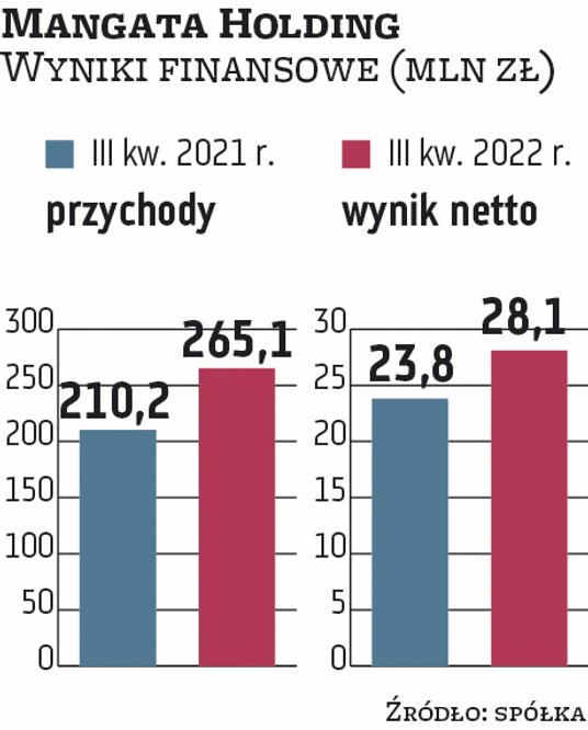 Po trzech kwartałach 2022 r. Mangata miała rekordowe 81,3 mln zł skonsolidowanego zysku netto, o 43 proc. więcej niż przed rokiem. EBITDA zwiększyła się o 34 proc., do 133,9 mln zł. Przychody były o 37 proc. wyższe i wyniosły 799,2 mln zł. Grupa produkuje m.in. podzespoły i komponenty dla dla motoryzacji.