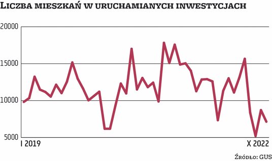 Według szacunków GUS w październiku deweloperzy ruszyli z budową 7,1 tys. mieszkań, o 44 proc. mniej niż rok wcześniej. To czwarty miesiąc z rzędu, kiedy statystyki utrzymują się na niskim poziomie. W skali dziesięciu miesięcy ruszyła budowa 101 tys. lokali, o 28 proc. mniej niż rok wcześniej i 4 proc. mniej niż w osłabionym pandemią 2020 r.