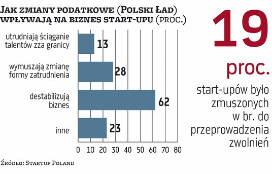 Zapowiedzi opuszczenia Polski przez 47 proc. firm zbadanych przez fundację to syrena alarmowa, że coś jednak poszło nie tak. I młodzi przedsiębiorcy wskazują co. Winą obarczają nie tylko czynniki zewnętrzne (wojna, spowolnienie gospodarcze, pandemia), ale również, a nawet przede wszystkim, działania rządu. Ich zdaniem kluczowa bariera rozwoju biznesu nad Wisłą to zbytnie skomplikowanie przepisów oraz brak stabilności prawnej i podatkowej, a także biurokracja. Blisko dwie trzecie pytanych oceniło, że zmiany wprowadzone w ramach Polskiego Ładu destabilizują ich biznes. Kolejne 28 proc. wskazuje, że nowe regulacje wymusiły na nich zmianę formy zatrudniania, a 13 proc., że ściąganie talentów z zagranicy stało się dla nich trudniejsze. Do tego w obliczu ostatnich kryzysów (gospodarczych i geopolitycznych) blisko połowa polskich firm, ankietowanych przez Startup Poland, podkreśliła, iż koszty prowadzenia ich działalności wzrosły w sposób znaczący. To podcięło im skrzydła – spółki przerzucają koszty na klientów (tak zrobiło 37 proc. start-upów) albo tną wydatki – w pierwszej kolejności na marketing i reklamę (28 proc.). Niemal co piąty badany start-up był z tego powodu już zmuszony do przeprowadzenia zwolnień. A to dopiero początek – analitycy prognozują falę bankructw w tej branży.