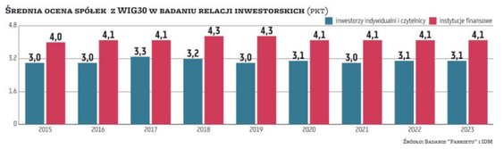 I tak np. w zeszłorocznej edycji w ankiecie na parkiet.com średnio spółki dostały 3,1 pkt, w skali od 1 do 6, czyli tyle samo, ile wynosi średnia z dotychczasowych edycji. Najnowsza wpisuje się w ten scenariusz: średnia ocena to również 3,1 pkt. Z jednej strony cieszy fakt, że mimo trudnego otoczenia rynkowego spółki dostały takie noty jak w poprzednich latach, ale z drugiej, trudno przecież uznać trójkę za dobrą ocenę. Nadal jest duża przestrzeń do poprawy w zakresie IR skierowanego do drobnych graczy. W najnowszej edycji tylko trzy firmy dostały co najmniej 4 pkt, a niemal połowa z całej trzydziestki została oceniona na niżej niż 3 pkt.