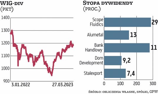 Również 0,2 zł na walor wypłaci w tym roku akcjonariuszom spółka Stalexport Autostrady. Tu jednak przekłada się to na wyższą, ponad 7-proc. stopę dywidendy. Wypłatę zaplanowano na 25 kwietnia, a ostatnim dniem, w którym można kupić akcje z prawem do dywidendy, jest 11 kwietnia. Walne zgromadzenie zaplanowano na 4 kwietnia. Jeszcze wyższa stopa dywidendy, przekraczająca 12 proc., szykuje się w Alumetalu. Akcjonariusze będą podejmować uchwałę w tej sprawie 18 kwietnia. Spółka wypłaciła już zaliczkę na poczet dywidendy za rok 2022, w kwocie 51,6 mln zł, czyli 3,3 zł na akcję. Zarząd rekomenduje, by pozostała część, czyli 10,52 zł na walor, została wypłacona 27 lipca. Dniem dywidendy ma być 27 kwietnia (czyli akcje trzeba kupić najpóźniej 25 kwietnia).