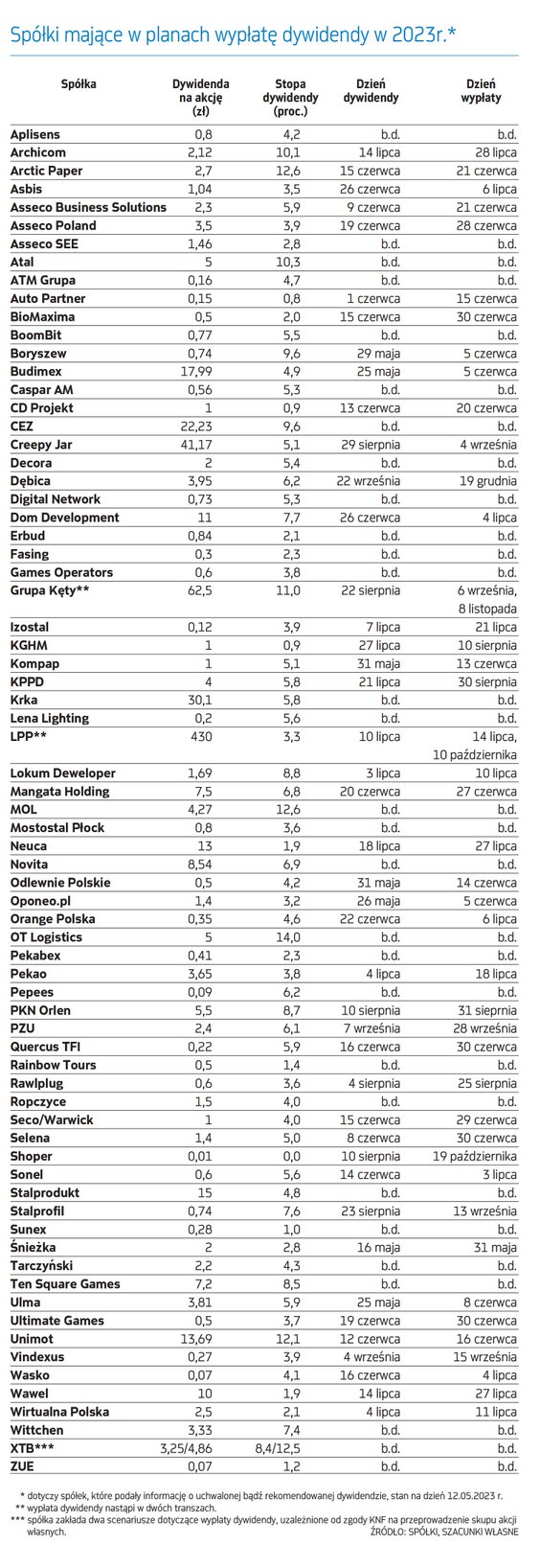 W czołówce spółek z GPW, które wypłacają duże dywidendy, jest też PZU. Ubezpieczyciel z wyniku za 2022 r. chce wypłacić wyższą dywidendę na akcję niż rok wcześniej. Do akcjonariuszy ma trafić nieco ponad 2,07 mld zł, czyli więcej, niż wyniósł cały zeszłoroczny zysk netto ubezpieczyciela (ok. 1,64 mld zł). Na wypłatę bowiem mają zostać przeznaczone także środki z kapitału zapasowego z zatrzymanej części zysku z 2021 roku. Na każdą akcję przypadnie więc 2,40 zł, co daje ponad 6-proc. stopę dywidendy.