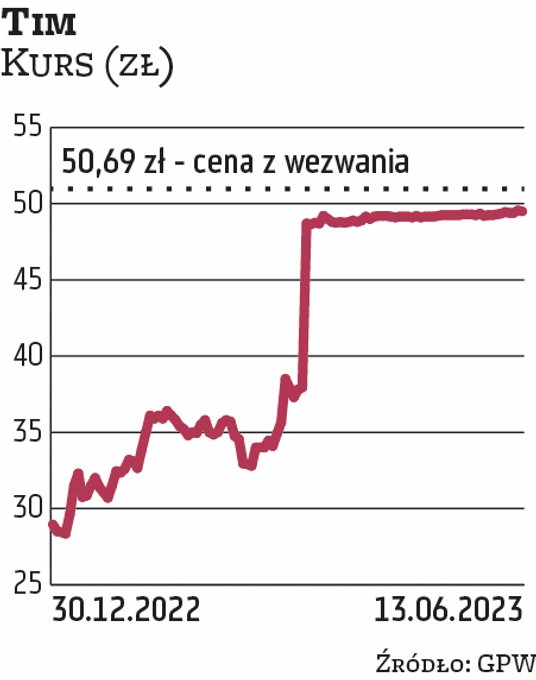 Od dnia upublicznienia planów wezwania notowania Timu oscylują wokół poziomu 49 zł, czyli wyraźnie poniżej ceny z wezwania ogłoszonego przez niemiecką Grupę Würth, która oferuje 50,69 zł za akcję. Ta różnica oznacza, że rynek raczej już nie wierzy w możliwość jej podniesienia.