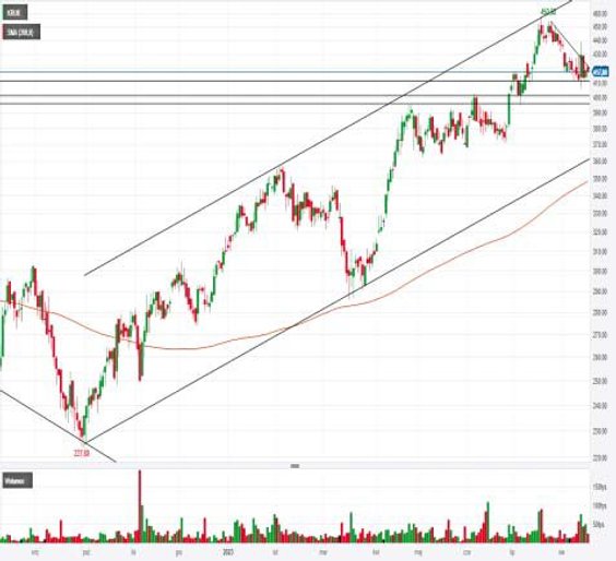 Popyt powinien wytrzymać nawet spadek w rejon 380 zł, wokół którego Kruk poruszał się od końca kwietnia do czerwca tego roku. W tym miejscu zakończyły się też zwyżki jesienią 2021 r., zatem szczyt z tamtego okresu również umacnia wsparcie wokół 380 zł. O ile w następnych tygodniach doszłoby do spadku w podobnym tempie do tego z pierwszych dni sierpnia, o tyle również w tym miejscu kurs zetknąłby się z dolnym ograniczeniem kanału wzrostowego.