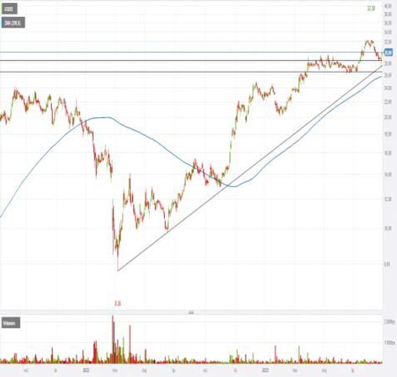 Taki układ może zwiastować rychłą zmianę nastrojów w handlu, czego potwierdzenie można było zaobserwować w poniedziałek – na niewiele przed końcem handlu Asbis zyskiwał 3 proc., mierząc się z pułapem 30 zł. Popyt w ten sposób otworzył sobie drogę do ataku na lokalne maksima.