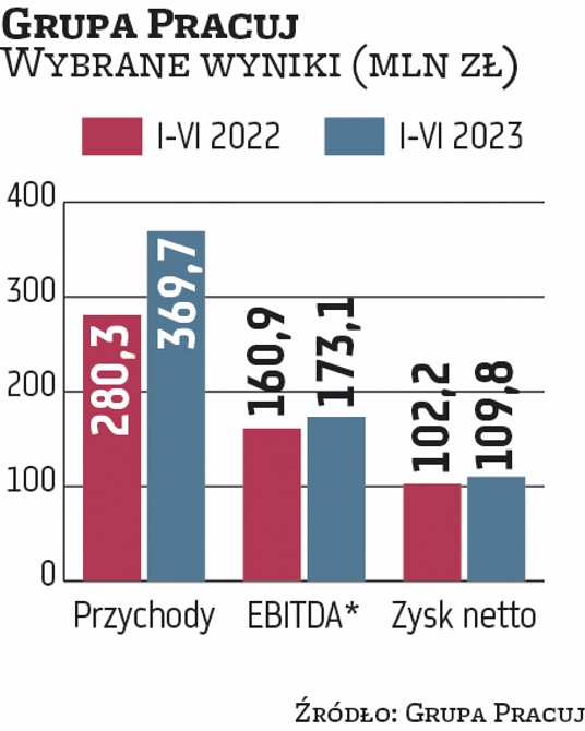 Spadający w ostatnich dniach kurs Grupy Pracuj odbił się w czwartek po publikacji wyników za II kwartał i pierwsze półrocze tego roku. Lider rekrutacji online w Polsce zakończył je z 369,7 mln zł skonsolidowanych przychodów ze sprzedaży, co oznacza prawie 32-proc. wzrost w ujęciu rocznym. Była to głównie zasługa przejętej w ubiegłym roku niemieckiej spółki Softgarden (silnego gracza w usługach HR Tech w modelu abonamentowym SaaS), która w I półroczu dodała do przychodów grupy ponad 92,6 mln zł.