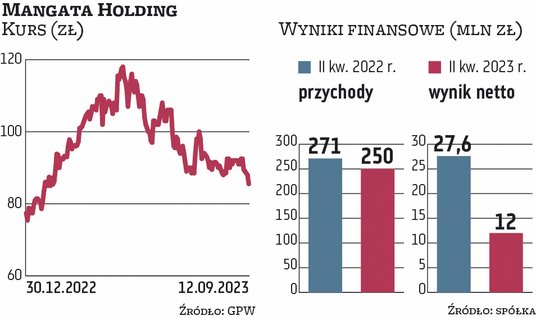 Zarząd zapewnia, że portfele zamówień spółek z holdingu utrzymują się na bezpiecznych poziomach, chociaż niższych niż w ubiegłym roku. Grupa dostrzega przesunięcia w terminach zamówień od klientów, a także wolniejszy spływ nowych zleceń. Z kolei obniżki cen surowców wzmacniają presję ze strony klientów na redukcję cen. – Jeśli chodzi o nasze oczekiwania na 2023 rok, zakładamy, że nasze przychody ze sprzedaży będą poniżej 1 mld zł, marża EBITDA wyniesie w okolicach 13–14 proc., marża wyniku netto od 6 do 7 proc. Wskaźnik zadłużenie netto może wynieść od 1,3 do 1,4 w zależności od harmonogramu wypłat związanych z realizowanymi inwestycjami – wskazuje Kazimierz Przełomski, wiceprezes i dyrektor finansowy Mangaty. W I półroczu grupa miała prawie 528 mln zł przychodów i marżę EBITDA na poziomie 13,6 proc. wobec 16,6 proc. rok wcześniej.