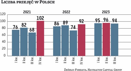 Mimo trudnego otoczenia makroekonomicznego i zawirowań geopolitycznych rynek przejęć radzi sobie bardzo dobrze. W samym III kwartale 2023 r. zawarto w Polsce 94 transakcje – wynika z najnowszych danych Fordaty i Navigatora. W analogicznym okresie 2022 r. transakcji było 74, czyli o 20 mniej. Również na przestrzeni ostatnich lat III kw. 2023 r. się wyróżnia. Liczba transakcji jest o 51 proc. wyższa od średniej z III kwartału z lat 2019–2022, a w ujęciu narastającym dynamika wynosi 43 proc. – wynika z naszych szacunków.
