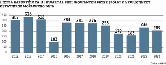 Kumulacja raportów to zjawisko obserwowane na NewConnect od dawna. Średnio w latach 2013–2022 ostatniego możliwego dnia na rynek trafiały 243 raporty – wynika z szacunków „Parkietu”. I choć wydawało się, że sytuacja się poprawia (w 2020 r. i 2021 r. ta liczba spadła poniżej 200), to zeszły i obecny rok przyniosły wzrost liczby maruderów. Nie można tego tłumaczyć rosnącą liczbą spółek, bo jest ich od sześciu lat na NewConnect coraz mniej. W 2017 r. emitentów było 408. Teraz, po uwzględnieniu tegorocznych debiutów, firm jest 360.