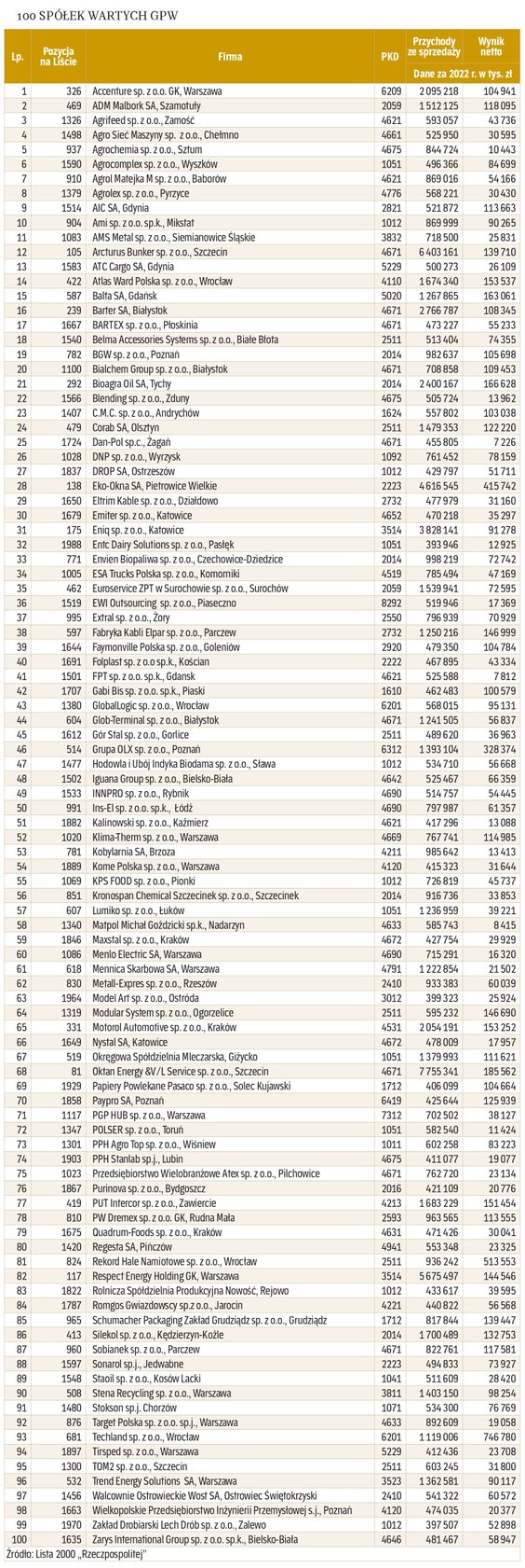 Największe firmy z zestawienia 100 firm wartych GPW reprezentują branżę paliwowo-energetyczną. Pierwsze miejsce zajmuje Oktan Energy & V/L Service ze Szczecina, którego przychody ze sprzedaży w 2022 r. przekroczyły 7,7 mld zł. Firma zajmuje się hurtową sprzedażą paliw. Podobnie jak firma Arcturus Bunker, także ze Szczecina, której przychody w ub.r. wynosiły 6,4 mld zł. Na trzecim miejscu plasuje się spółka Respect Energy Holding zajmująca się handlem energią elektryczną, z przychodami niemal 5,7 mld zł.