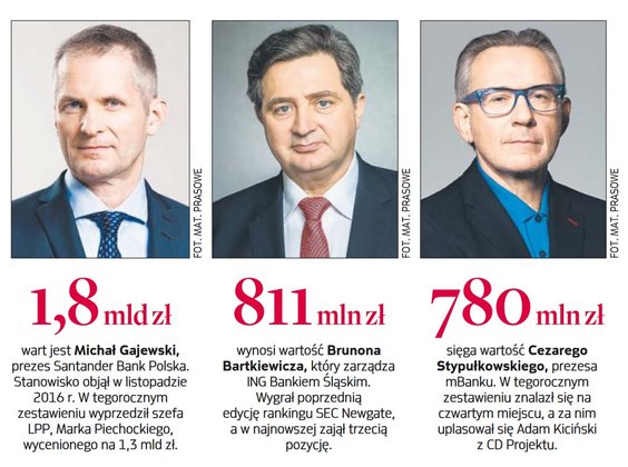 Zeszłorocznego zwycięzcę, Brunona Bartkiewicza z ING Banku Śląskiego, zmienił na prowadzeniu Michał Gajewski z Santander Bank Polska. Jego wartość oszacowano na ponad 1,8 mld zł. Gajewski z bankowością związany jest od ponad trzech dekad. Stanowisko prezesa w Santander BP zajął kilka miesięcy po odejściu Mateusza Morawieckiego.