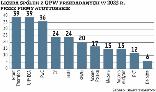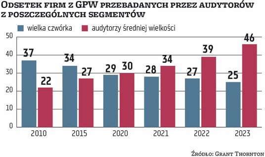 W 2023 r. sprawozdania spółek giełdowych badało 37 firm audytorskich. Rok wcześniej było ich 46, w 2021 r. 48, w pandemicznym 2020 r. 61, a w 2013 r. ponad 100 – wynika z raportu Grant Thorntona. Tak mocna konsolidacja rynku to m.in. pokłosie zmian legislacyjnych. Wprowadzono dodatkowe uwarunkowania, wymagające inwestycji w infrastrukturę i kadry, z czym nie poradziły sobie małe firmy audytorskie. Wiele zniknęło z rynku. Mocno skurczył się też udział wielkiej czwórki, czyli Deloitte, EY, KPMG oraz PwC. To również miało związek ze zmianą regulacji, przede wszystkim z wymogiem rotacji oraz wprowadzeniem zakazu doradztwa w audytowanych podmiotach.