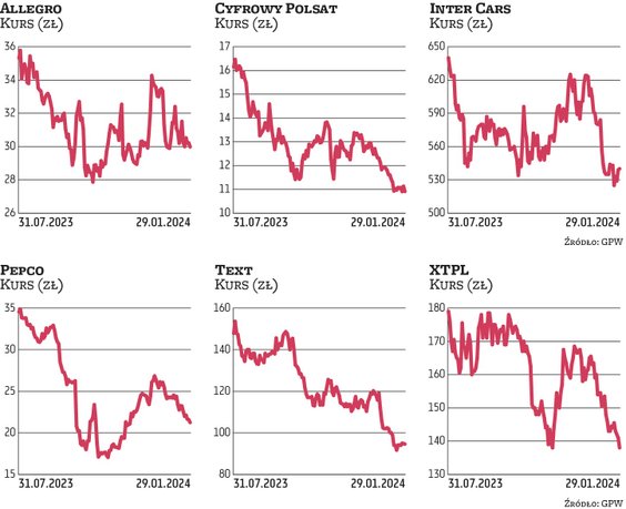 Wyraźnie z tyłu za innymi spółkami z indeksu WIG20 pozostaje Allegro. Notowania od dołka z końca 2022 r. na poziomie ok. 18 zł zaczęły odrabiać straty, ale zwyżki były często przeplatane korektami mimo sprzyjającej koniunktury na GPW. Odbiciu notowań nie pomagały transakcje sprzedaży akcji spółki dokonywane przez dominujących akcjonariuszy (w 2023 r. dwukrotnie przeprowadzono ABB), które podkopywały wiarę pozostałych inwestorów w spółkę. Dlatego zdaniem analityków ostatnia podaż to najprawdopodobniej wynik obaw, z wygasającym w styczniu właśnie 90-dniowym lock upem, ustanowiony przez głównych akcjonariuszy po październikowych transakcjach pakietowych. – Wydaje mi się że czynnik związany z potencjalną podażą akcji w ABB jest główną przyczyną takiego rozczarowującego zachowania kursu – uważa Tomasz Sokołowski, analityk BM Santander. Z aktualnych rekomendacji analityków wynika, że aktualna cena akcji Allegro w okolicach 30 zł jest atrakcyjna (wyceny zawierają się w przedziale 32–42 zł). Spółka może się pochwalić poprawiającymi się wynikami w Polsce, a dalsza poprawa GMV znajdzie odzwierciedlenie we wzroście wyniku EBITDA.