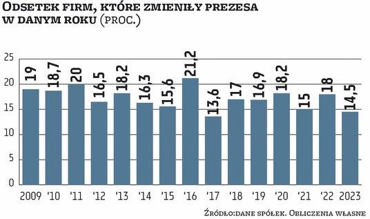 Rozpędzające się „kadrowe tsunami” może wybić w górę obliczany przez „Parkiet” wskaźnik rotacji szefów firm notowanych na GPW. W minionym roku spadł on do 14,5 proc. – do poziomu najniższego od sześciu lat. Mniej (13,6 proc.) giełdowych prezesów wymieniono ostatnio w 2017 roku, który również był okresem przejściowej stabilizacji po okresie powyborczych roszad w spółkach kontrolowanych przez państwo.