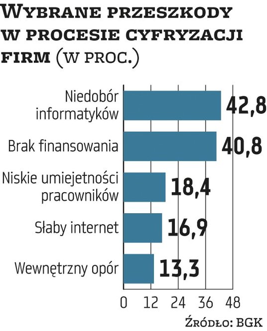 Wśród przeszkód na drodze ku cyfryzacji firmy wymieniają też m.in. niedobór informatyków, słabe umiejętności pracowników, niską jakość internetu i opór wewnętrzny przed zmianą.
