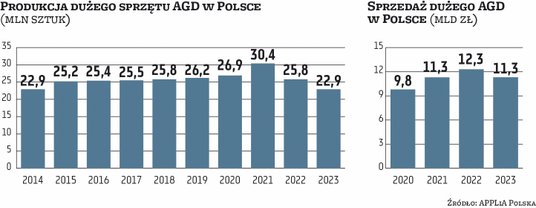 Organizacja podaje, że w Polsce w 2023 r. wyprodukowano 26 mln urządzeń AGD, w tym prawie 23 mln szt. dużego AGD. – Oznacza to cofnięcie się ze skalą produkcji do wyniku za 2014 r. przy utrzymaniu mocy produkcyjnych – dodaje APPLiA.