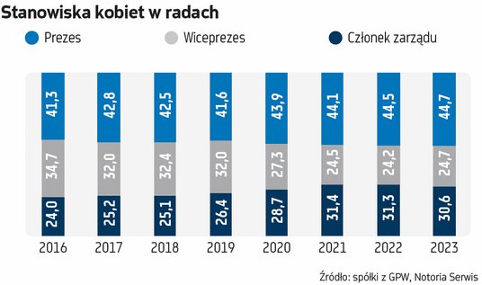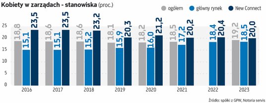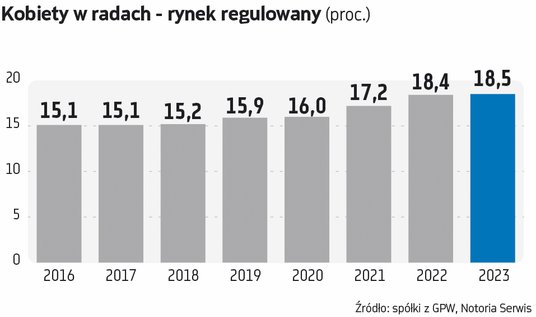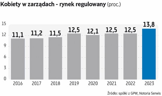 Warto też wspomnieć o obowiązujących od 2021 r. dobrych praktykach spółek notowanych na GPW. Od tego momentu w tych regulacjach pojawił się nowy wymóg w zakresie posiadania przez spółki polityki różnorodności wobec zarządu oraz rady nadzorczej. Dokument taki powinien określać cele i kryteria różnorodności m.in. w takich obszarach jak płeć, kierunek wykształcenia, specjalistyczna wiedza, wiek oraz doświadczenie zawodowe, a także wskazywać termin i sposób monitorowania realizacji tych celów. W zakresie zróżnicowania pod względem płci warunek zapewnienia różnorodności organów spółki ma miejsce, w przypadku kiedy udział mniejszości w danym organie nie jest niższy niż 30 proc. Według ostatnich danych wymóg ten spełnia 11 proc. spółek z rynku regulowanego.