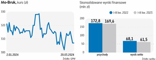 W tym roku akcjonariusze Mo-Bruku prawdopodobnie otrzymają do podziału co najmniej połowę ubiegłorocznego zysku netto spółki. Ile to konkretnie może być, będzie bliżej wiadomo 25 kwietnia, gdy zostanie opublikowany zaudytowany raport roczny. – W 2024 roku zarząd spółki planuje zarekomendować wypłatę dywidendy w przedziale 50–100 proc. zysku netto z ubiegłego roku, zakładając, że jedynie nadzwyczajne okoliczności mogłyby skłonić do obniżenia tej kwoty – twierdzi Wiktor Mokrzycki, wiceprezes Mo-Bruku. W ubiegłym roku do podziału przeznaczono 46,3 mln zł, co wiązało się z wypłatą 13,17 zł na każdą akcję. Po trzech kwartałach 2023 r. grupa wypracowała 61,5 mln zł zysku netto, co w ujęciu rok do roku oznaczało spadek o 9,6 proc.