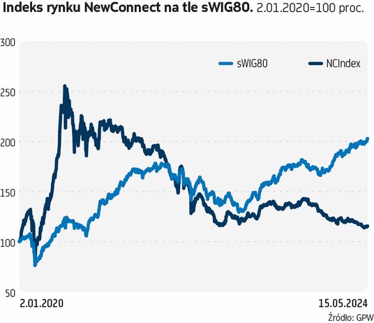 Był to czwarty tegoroczny debiutant. W sumie na NewConnect notowanych jest obecnie 357 firm. Od 2011 r. ich liczba systematycznie maleje. Analogiczne zjawisko widać na rynku głównym, ale tam od kilku kwartałów indeksy idą mocno w górę, bijąc kolejne rekordy. Tymczasem NCIndex od czterech lat spada. Z sWIG80, licząc od 2020 r. (zanim doszło do covidowych zawirowań), przegrywa aż o 87 pkt proc. Już od kilku miesięcy utrzymuje się poniżej psychologicznego poziomu 300 pkt.