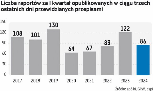 Średnio niemal sto raportów za I kwartał trafiało na rynek w trakcie trzech ostatnich dni przewidzianych przepisami w latach 2017–2023 – wynika z analizy „Parkietu”. Rok 2024 wpisuje się w tę statystykę. Ostatnim dniem na publikację raportu był 31 maja. Z naszych szacunków wynika, że w okresie od 29 do 31 maja spółki z rynku głównego opublikowały w sumie niemal 90 raportów. Z reguły największą kumulację obserwujemy ostatniego dnia, ale ten sezon był wyjątkowy, ponieważ przed piątkiem 31 maja było Boże Ciało – zdecydowana większość spółek chciała zdążyć z publikacją przed długim weekendem. Ponad 60 raportów zostało opublikowanych w środę (29 maja), kilka w Boże Ciało (30 maja), a tylko kilkanaście w piątek (31 maja).