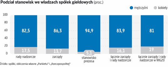 „Parkiet” sprawdził, jaki jest aktualny odsetek pań we władzach wszystkich spółek notowanych na rynku głównym warszawskiej giełdy. Wnioski? W sumie na kobiety przypada 16,1 proc. stanowisk w zarządach i radach nadzorczych (niemal 530 kobiet vs. ponad 2740 mężczyzn). W samych radach nadzorczych jest to 17,5 proc. (ponad 360 vs. ponad 1,7 tys.), a w zarządach 13,7 proc. (ponad 160 vs. ponad 1 tys.). Jeszcze gorzej wygląda sytuacja, jeśli chodzi o stanowisko prezesa zarządu. Tam kobiety stanowią zaledwie 5,1 proc.