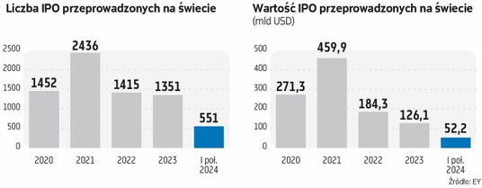 W sumie na świecie w I połowie 2024 r. zadebiutowało 551 spółek, które pozyskały 52,2 mld USD. To odpowiednio o 12 proc. i o 16 proc. mniej niż rok temu, ale to w dużej mierze efekt wspomnianej już sytuacji w Chinach.