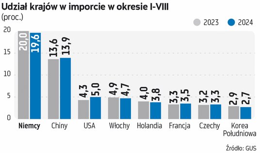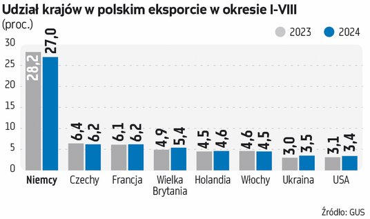 Udział Niemiec w eksporcie w okresie styczeń–sierpień 2024 r. spadł rok do roku o 1,2 pkt proc., do 27 proc., a w imporcie o 0,4 pkt proc., do 19,6 proc. – wynika z najnowszych danych GUS. Wpisują się one w obserwowany już od kilku kwartałów niepokojący obraz niemieckiej gospodarki.