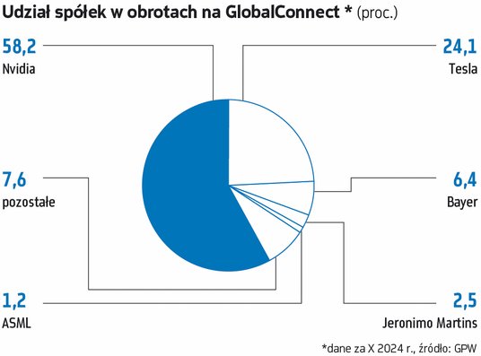 Nieco ponad dwa lata temu wystartował GlobalConnect, czyli rynek GPW, który umożliwia inwestowanie w akcje globalnych spółek w polskiej walucie. Na razie dopiero zyskuje popularność. Choć dynamika miesięcznych obrotów jest imponująca, to należy pamiętać o niskiej bazie. W październiku 2024 r. obroty wzrosły tam niemal siedmiokrotnie, z 0,53 mln zł do 3,55 mln zł.
