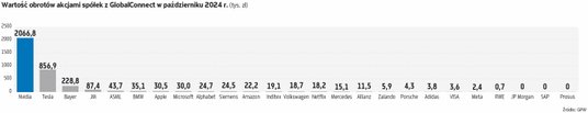 Zdecydowanie największym zainteresowaniem na GlobalConnect, patrząc przez pryzmat udziału w obrotach akcjami, cieszą się Nvidia i Tesla. Według ostatnich dostępnych statystyk, czyli danych za październik, Nvidia miała aż 58-proc. udział w obrotach na GC. Ich wartość przekroczyła 2 mln zł wobec niespełna 3,6 mln zł na całym rynku. Z kolei Tesla uplasowała się na pozycji wicelidera z 857 tys. zł, co oznacza nieco ponad 24-proc. udział. Trzecie miejsce zajmuje Bayer, ale od dwóch wspomnianych firm dzieli go przepaść. Wartość obrotów jego akcjami za zeszły miesiąc wyniosła zaledwie 229 tys. zł, co dało mu 6,4-proc. udział.