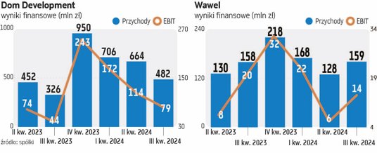 Ostatnie miesiące roku to z reguły bardzo udany okres dla deweloperów mieszkaniowych, co ma związek z kumulacją przekazań mieszkań, czego dowodem są wyniki IV kwartału, który na ogół jest najlepszym okresem w ciągu całego roku. – Wyniki deweloperów mieszkaniowych są efektem księgowania przychodów ze sprzedaży lokali. Przychody z reguły wykazywane są w momencie przekazywania mieszkania klientowi, czyli po zakończeniu budowy i uzyskaniu pozwolenia na użytkowanie. Najczęściej budowa bloków mieszkalnych trwa ok. 18 miesięcy. Najwięcej inwestycji rozpoczynanych jest wiosną, a koniec budowy z reguły wypada więc jesienią kolejnego roku. W przypadku wielu deweloperów najwięcej mieszkań księgowanych jest w ostatnim kwartale roku i wtedy wyniki są najlepsze – wyjaśnia Dariusz Nawrot, analityk Noble Securities. Na uznanie inwestorów mogą jednak liczyć te spółki, które będą w stanie zabłysnąć na tle dokonań sprzed roku. – W IV kwartale 2024 r., moim zdaniem, dobre wyniki osiągnie Dom Development. Spodziewam się wzrostu liczby przekazywanych lokali o ok. 35 proc. r./r. i podobnego wzrostu zysku netto, ale w porównaniu z III kwartałem br. będzie to już wzrost o ponad 300 proc. – szacuje ekspert.