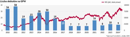 Jedyną spółką, która zadebiutowała w 2024 r. na rynku głównym GPW i przeprowadziła ofertę publiczną, była Żabka (więcej w ramce). W sumie pojawiło się dziewięć firm, ale pozostała ósemka przeniosła się z NewConnect. W całej historii „małej giełdy” na ten krok zdecydowało się już równo 100 firm. W 2025 r. to grono się powiększy. Niestety, na nowych dużych debiutantów spoza NewConnect na GPW na razie nie ma co liczyć.