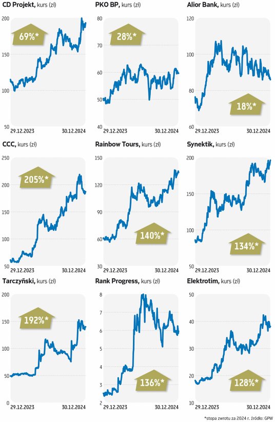 Koniunktura na warszawskiej giełdzie w tym roku była bardzo kapryśna, co jednak nie przeszkodziło w wypracowaniu efektownych stóp zwrotu. Czy dobra tegoroczna passa liderów zwyżek najważniejszych segmentów naszego rynku ma szanse na kontynuację w 2025 roku?