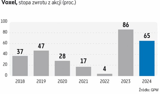 Niesłabnącym popytem cieszą się akcje spółki Voxel, co przełożyło się na siedem wzrostowych lat z rzędu, przynosząc średnią roczną stopę zwrotu na poziomie ponad 40 proc. Akcje od kilku lat pozostają w trendzie wzrostowym, ale w 2023 r. zwyżka wyraźnie przyspieszyła. W zakończonym niedawno roku dały zarobić blisko 65 proc. Spółka koncentruje swoją podstawową działalność na perspektywicznym rynku ochrony zdrowia, koncentrując swoją podstawową działalność na wykonywaniu obrazowych badań diagnostycznych. Voxel w ostatnich latach znacząco poprawił rentowność biznesu dzięki wyższym wycenom badań refundowanych, co przełożyło się na efektowny wzrost zysków. Dodatkowym atutem spółki jest regularna dywidenda, która jest możliwa dzięki stałemu przypływowi gotówki. Zdaniem analityków kluczem do poprawy wyników spółki w długim terminie jest wzrost wolumenów wykonywanych badań oraz wzrost wyceny świadczeń.