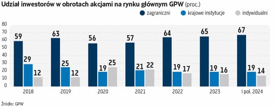 Daje się zauważyć długofalowy trend rosnącej roli inwestorów z zagranicy. Z kolei aktywność drobnych graczy mocno zależy od koniunktury panującej w danym okresie. Dobrze pokazują to lata covidowej hossy, kiedy w okresie 2020–2021 inwestorzy indywidualni odpowiadali za ponad 20 proc. obrotów. Od 2022 r. ich udział spada, ale i tak jest wyższy niż w latach 2018–2019, kiedy wynosił zaledwie 12 proc.