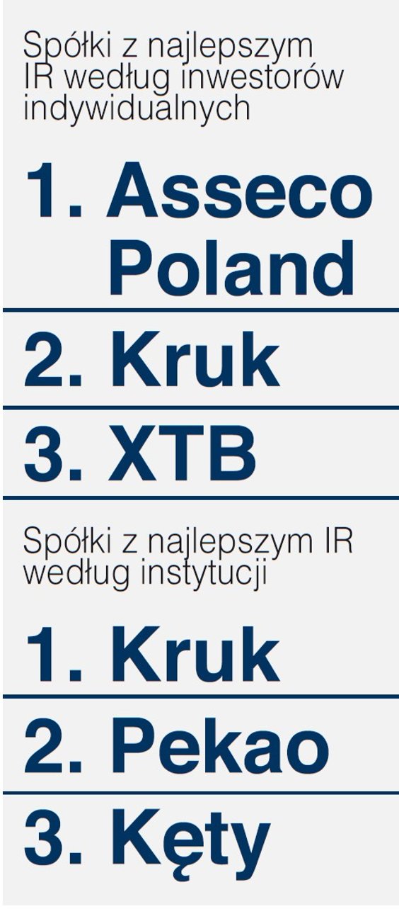 Spółki dostały od inwestorów indywidualnych średnio 3,3 pkt w skali 1–6. Zdecydowanym zwycięzcą jest Asseco Poland (również zeszłoroczny lider) z aż 4,65 pkt. Artur Wiza, wiceprezes Asseco Poland, podkreśla, że podstawą IR jest komunikacja i ludzie, bo jak sama nazwa wskazuje, „relacje” są tu najważniejsze.